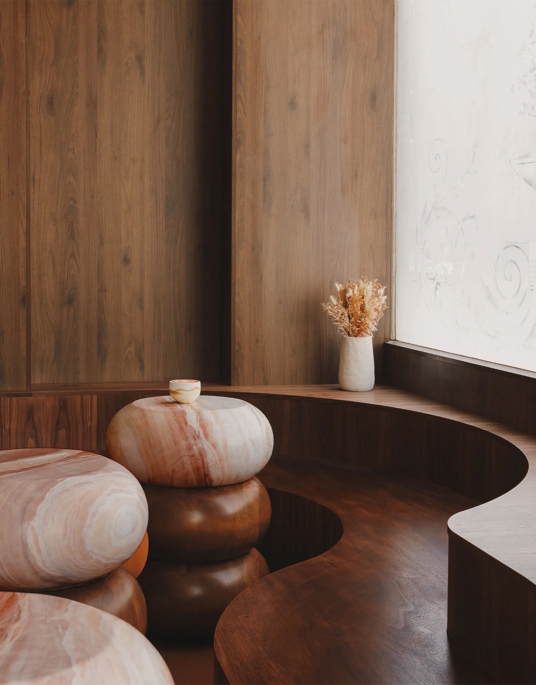 Conceived during a walk in the forest, Mushroom captures the spirit of natural forms. This side table, sculpted from Rosso Levanto marble, celebrates the encounter between the warmth of wood and the mineral essence of stone.